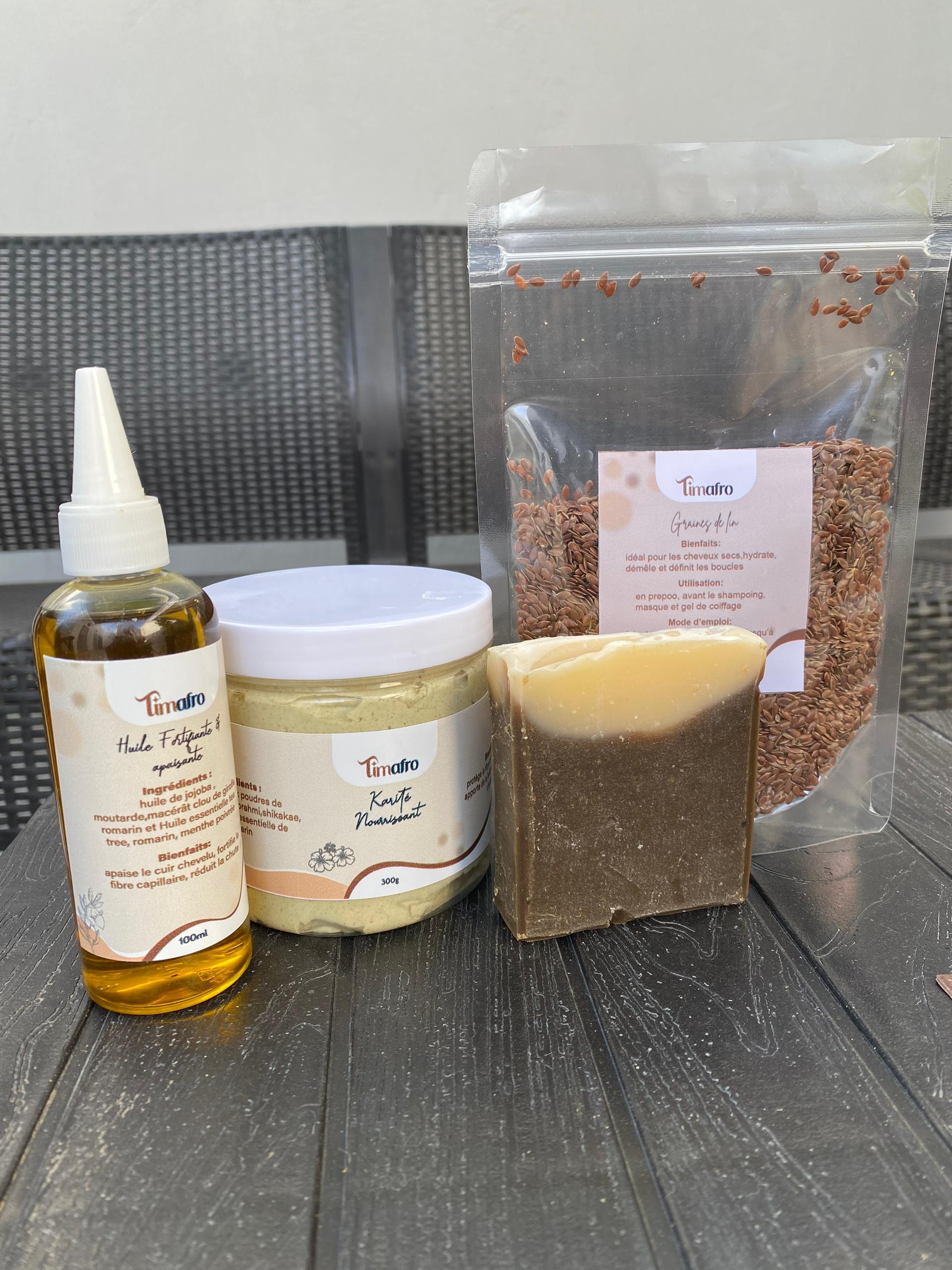 Ce coffret réunit les essentiels Timafro pour chouchouter tes cheveux de la racine aux pointes : - Karité nourrissant pour hydrater et sceller l’hydratation, - Huile fortifiante & apaisante pour stimuler la pousse et calmer le cuir chevelu, - Shampoing naturel au Brahmi pour nettoyer en douceur sans assécher. Une routine complète, naturelle et adaptée aux cheveux crépus, bouclés et texturés.