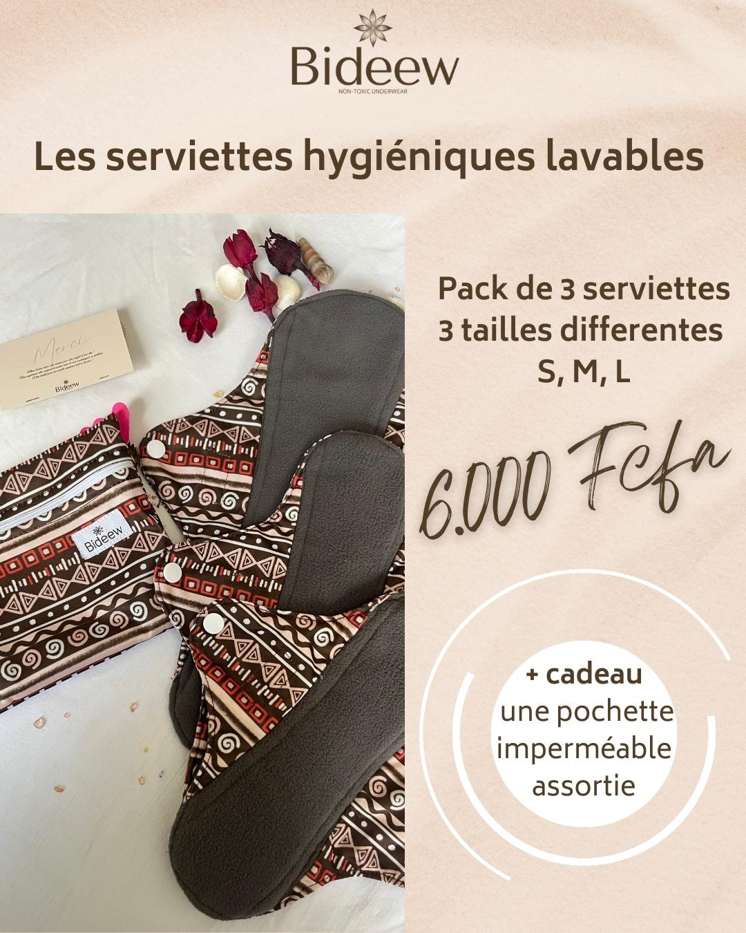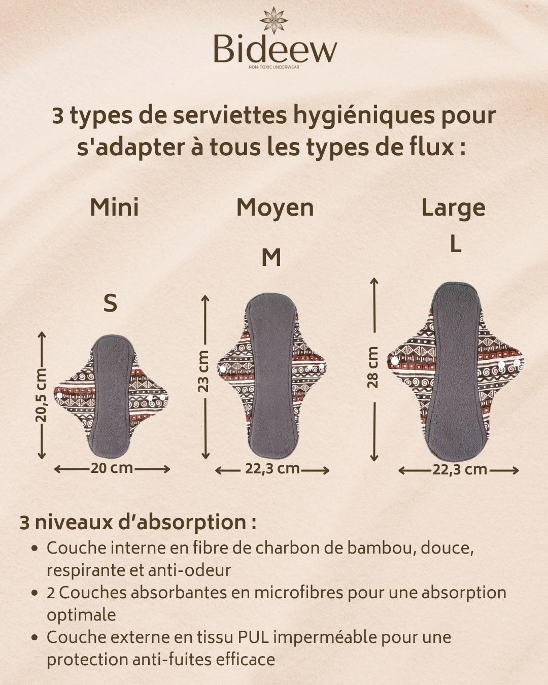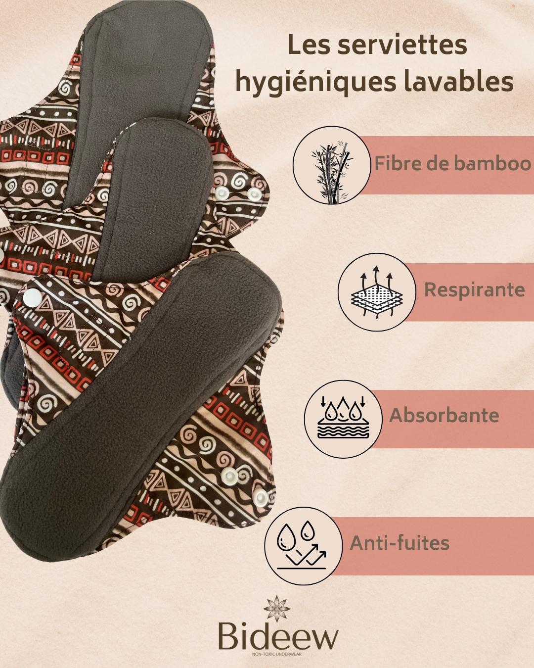 Les serviettes hygiéniques lavables sont conçues en fibres naturelles de bambou. Elles offrent une protection fiable, confortable et respirante au quotidien. Ce pack comprend 3 serviettes de tailles S, M, L pour s’adapter à tous les flux, elles sont accompagnées d’une pochette imperméable de rechange pratique pour le transport et le rangement.